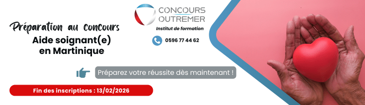 Vous souhaitez devenir aide soignant(e) en Martinique ? CONCOURS OUTREMER, vous propose de vous préparer aux épreuves de ce concours, de façon personnalisée, en présentiel dans nos locaux situés à Ducos pour les cours en salle et à distance avec nos cours en ligne et notre plateforme interactive. Fin des inscriptions : 13 février 2026